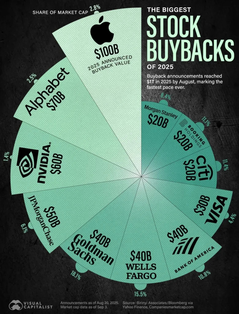 - ปีนี้ (2025) มูลค่าการซื้อหุ้นคืน (Stock Buybacks) ของบริษัทสหรัฐฯ ทะลุ 1 ล้านล้านดอลลาร์สหรัฐ ตั้งแต่เดือนสิงหาคม นับว่าเติบโตเร็วที่สุดในประวัติศาสตร์